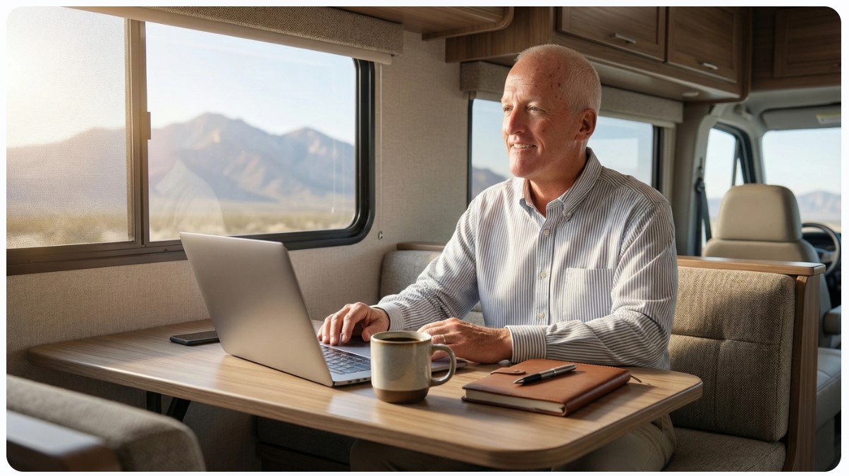 Full-time RV laptop workspace with a scenic mountain view, showing how RVers run a small online business while traveling and living on the road